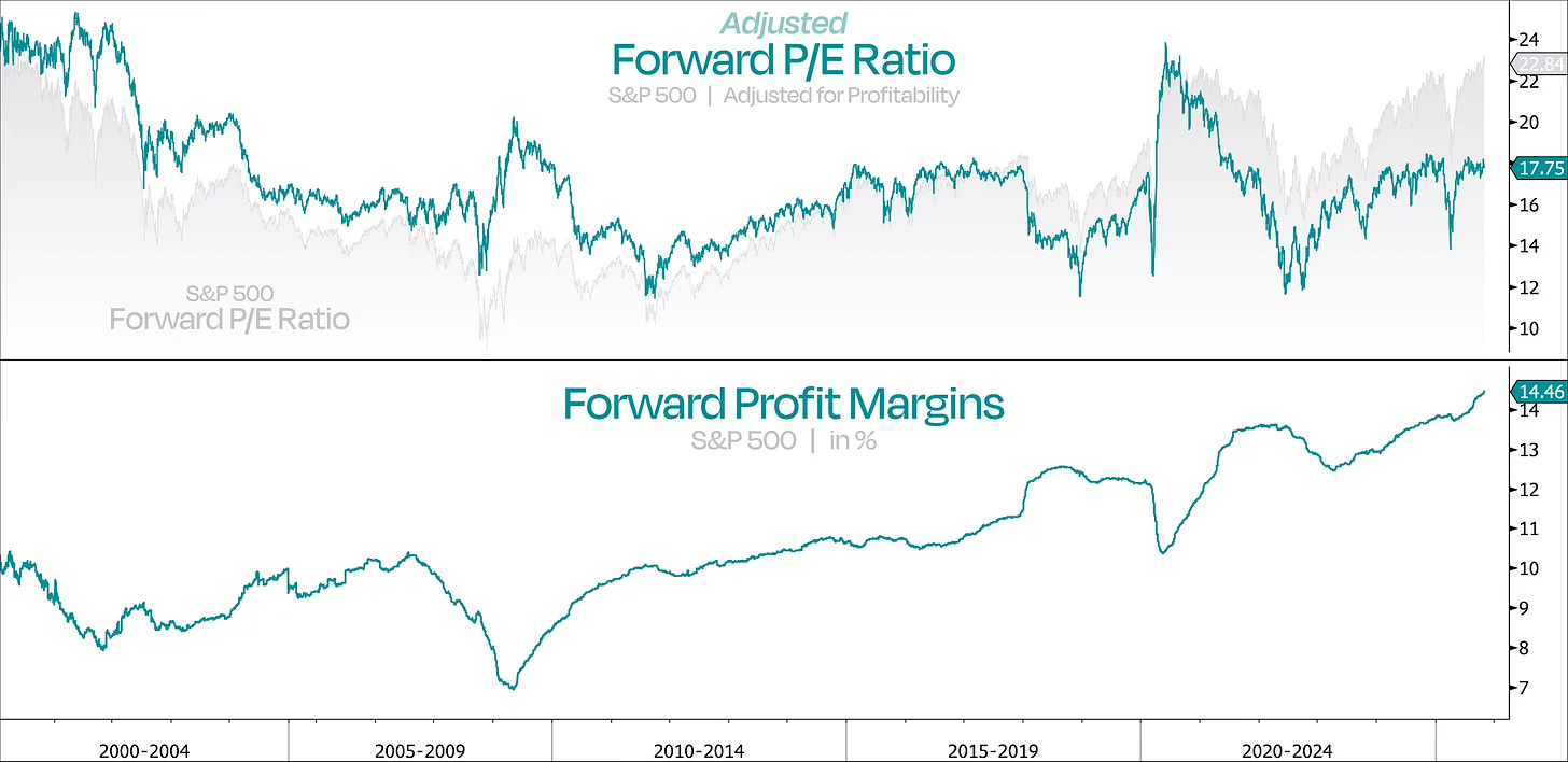 Duality Research found that the profitability-adjusted P/E for the S&P 500 is just 17.75x, less than one standard deviation above its 20-year average of 16.2x.
