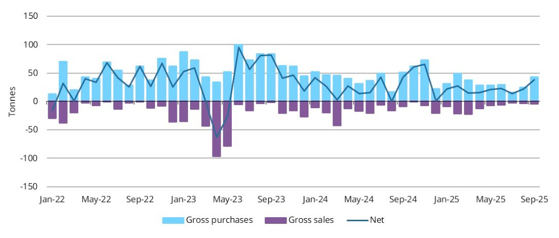 Central banks aren’t slowing down. Global gold purchases jumped 79% month-over-month, and represent the largest month of net buying all year. With governments carrying record levels of debt and inflation risks lingering, central banks appear to be diversifying away from fiat exposure, a trend we’ve been flagging for months.