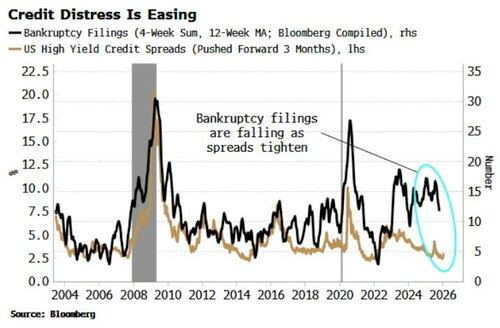 Despite the selloff in regional bank stocks, U.S. bankruptcy filings — one of the most forward-looking indicators of credit stress — are falling sharply.