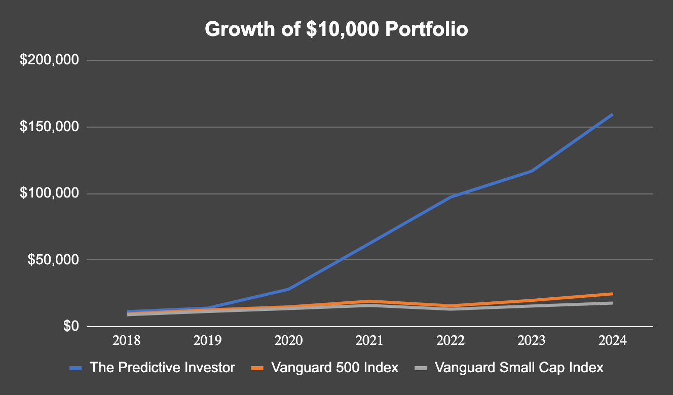 Additionally, our own experience running The Predictive Investor newsletter shows the superiority of selecting stocks based on factors. The chart below shows our 7-year performance against Vanguard’s 500 and small cap index funds. A $10,000 portfolio following The Predictive Investor grew to nearly $160,000 (vs. $25,000 for the S&P 500).