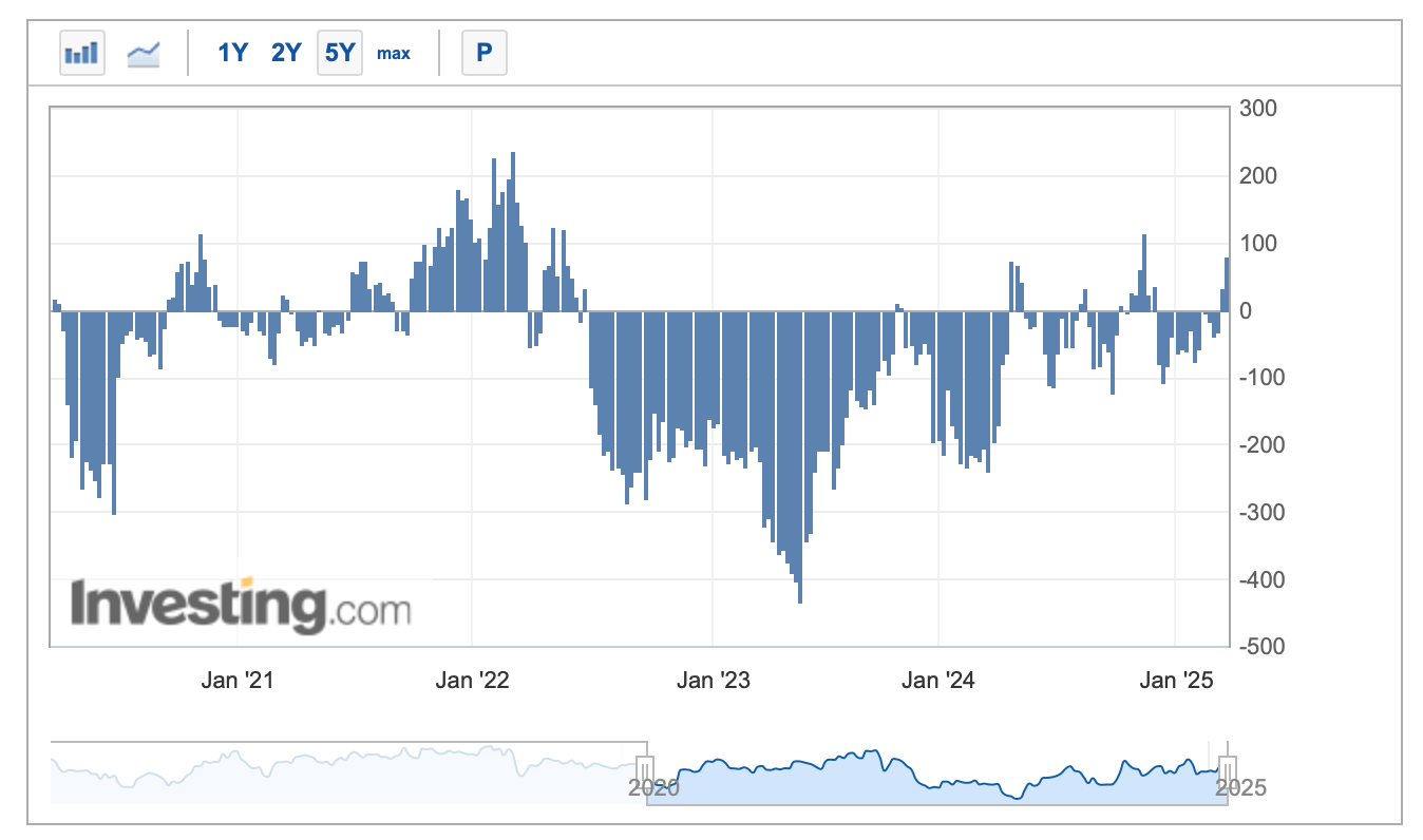 I previously highlighted extreme pessimism in the AAII investor survey. The Investors’ Intelligence survey has been around much longer, and measures advisor sentiment. The latest survey shows bears now outnumber bulls for the first time since the market bottom in 2022.