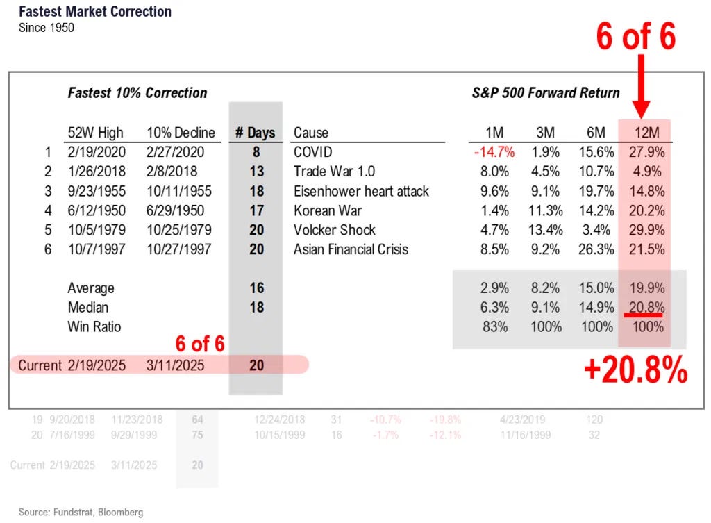 The good news is fast selloffs have been excellent buying opportunities, with the market moving higher 3, 6 and 12 months later 100% of the time.