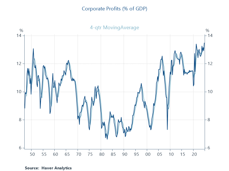 Corporate profits as a percent of GDP hit a record high last quarter.