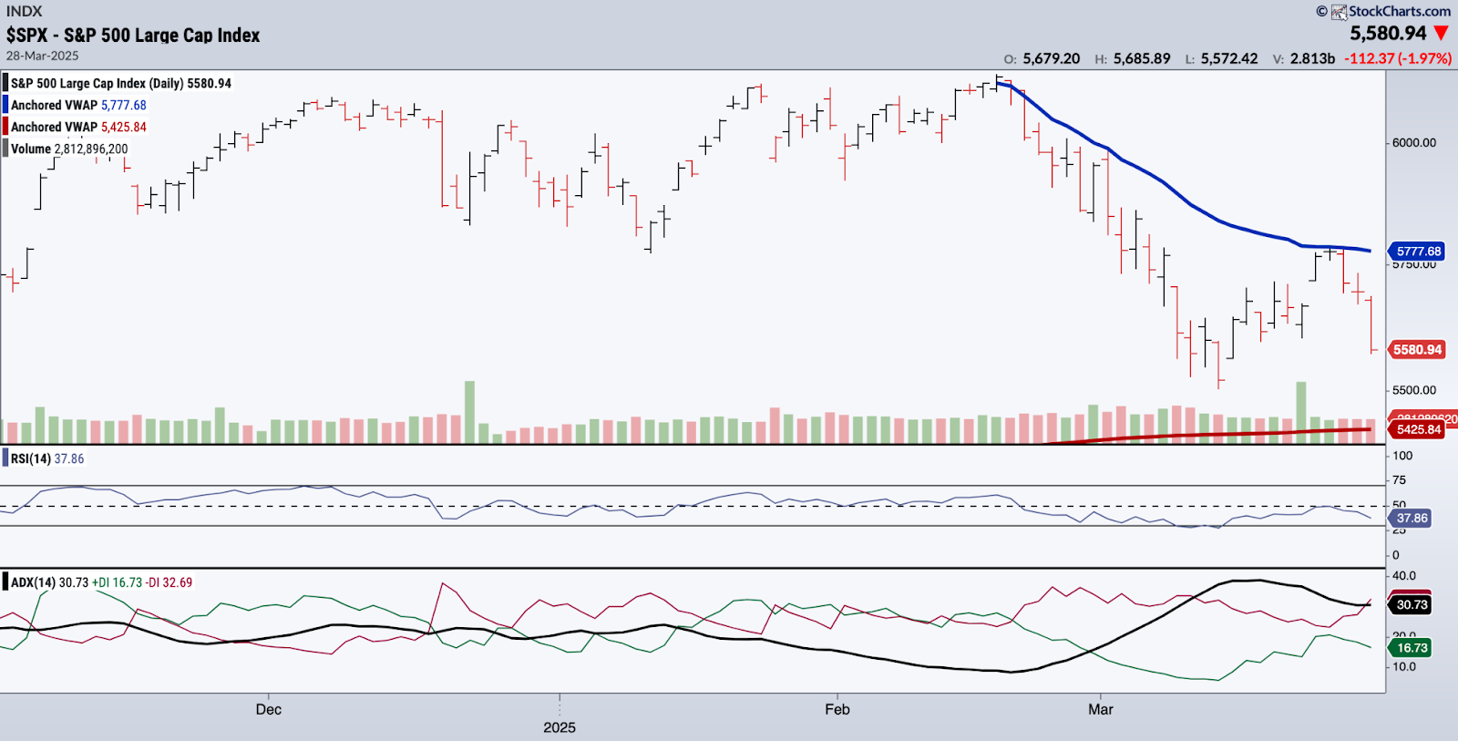 The S&P 500 failed at the 2/19 AVWAP (blue line), which represents the average price paid since the market’s high. This means bears are still in control of this market, and traders are selling into strength.