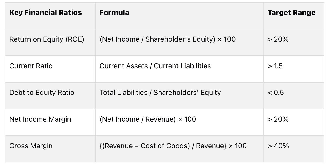 Current Ratio: Set this above 1.0 to ensure the company has more current assets than liabilities.