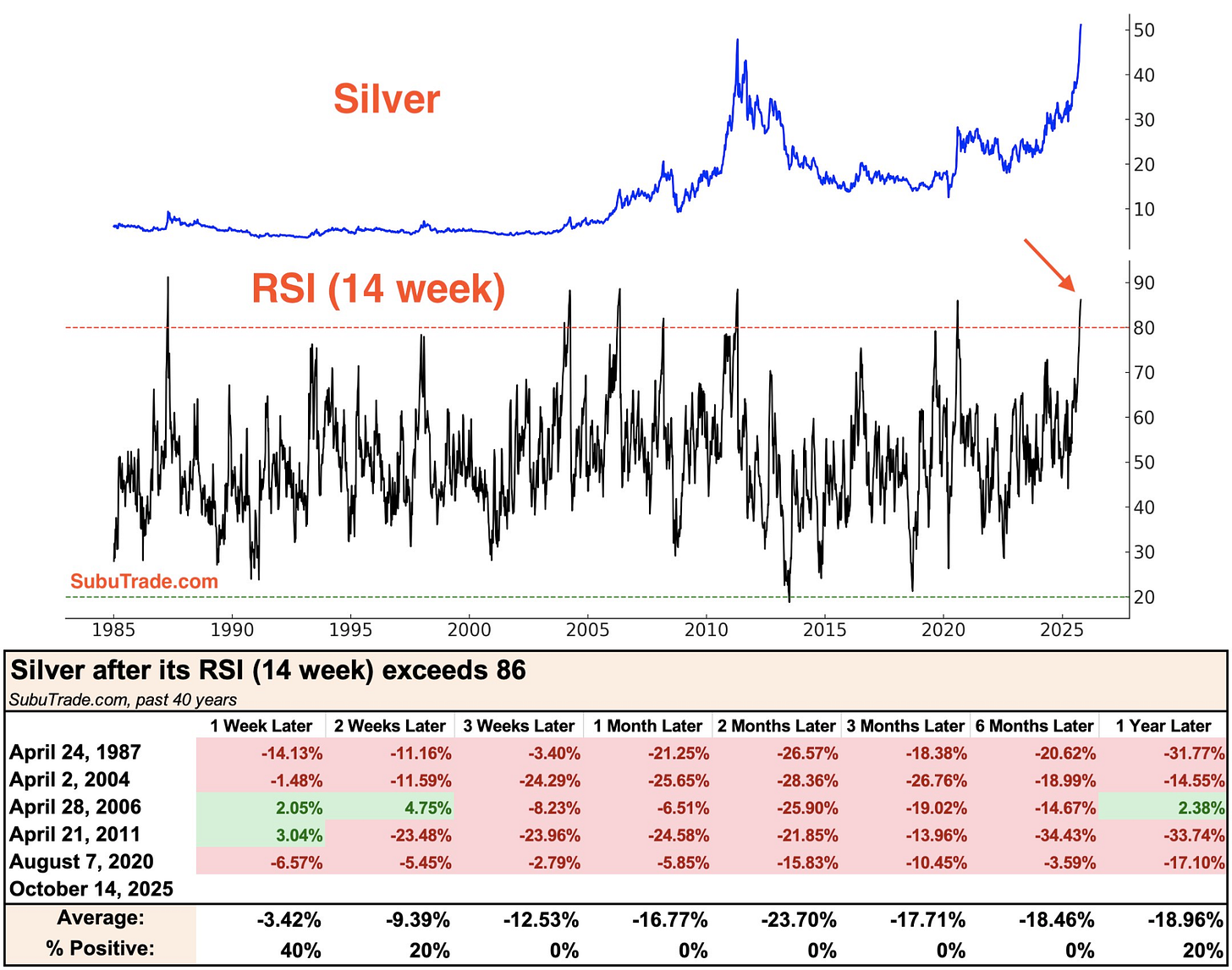 Silver has been on a tear, nearly going parabolic alongside gold. But the metal’s weekly RSI (a momentum measure) is now at one of its highest levels ever, which has historically preceded short-term pullbacks.