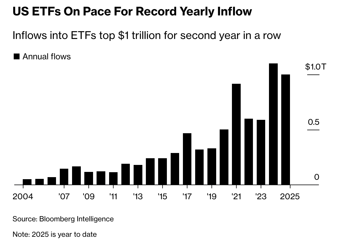 Despite short-term volatility, money continues to pour into ETFs. U.S. ETF inflows are on track for a record year, showing that most investors aren’t panicking.