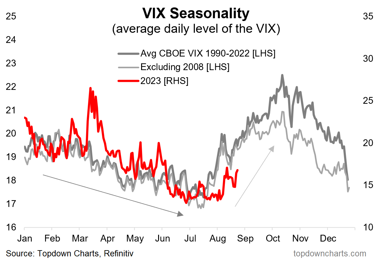 This is all against the backdrop of a rising VIX, which historically occurs late summer through mid-fall (chart below), suggesting we are likely to see increased volatility over the next few months.