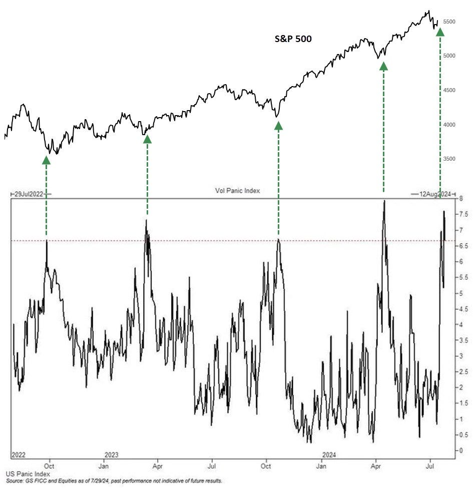 The Goldman Sachs US Panic Index, which tracks four equity volatility metrics, hit one of the highest levels in the last two years. Spikes of this degree have been previously indicated short-term bottoms in stocks.