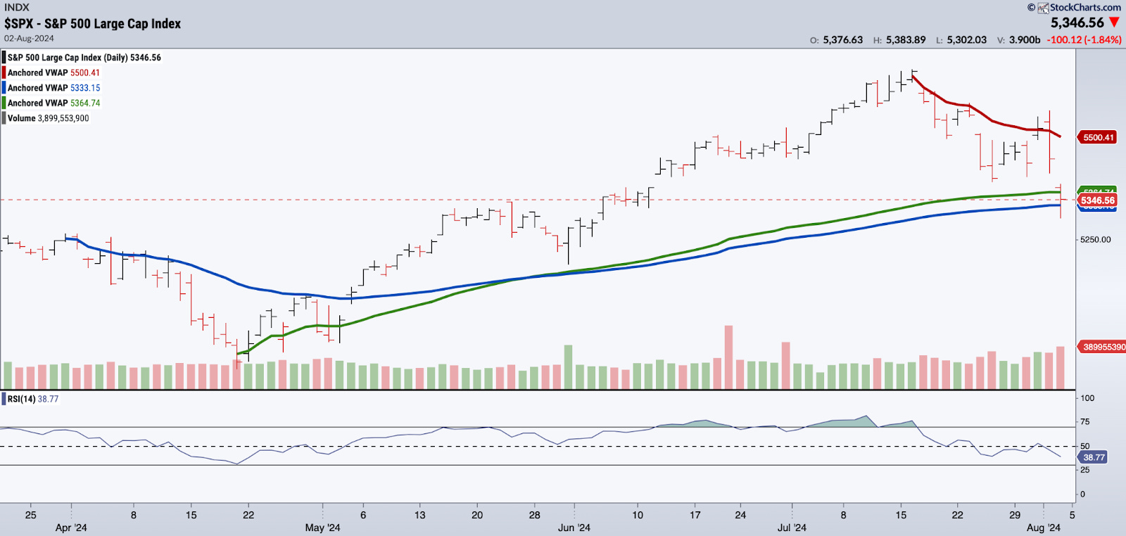 If some of the downside momentum wanes next week we will use the opportunity to add to the portfolio. The near-term uptrend will resume when the index trades above the 7/16 AVWAP (red line), currently at 5500.