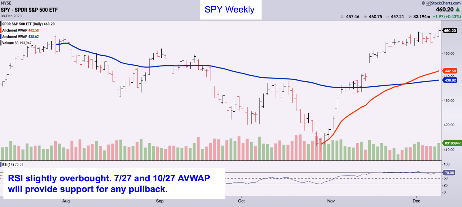 SPY closed at a high for the year, and is within striking distance of its all time high of $467.13. Trading activity over the last week has been flat, as the bulls are hesitant to drive prices higher with the market so overbought over the short term. This is normal after the strong rally we had last month. We’re at a point where the Fed could easily cause some volatility to the upside or downside. Our portfolio is well positioned to capture any continued upside momentum. And if we get a pullback, we’ll be watching the 7/27 and 10/27 AVWAPs as downside targets, both 4-5% below current levels.