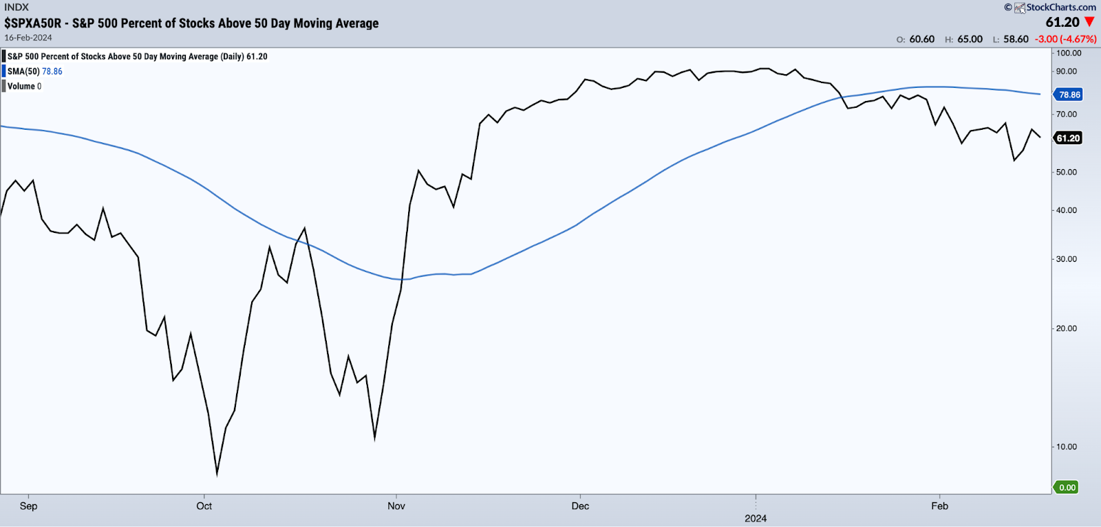 Breakouts with staying power are supported by an increasing number of stocks participating in the upswing, like we saw last November. The current breakout to new highs is driven by fewer and fewer stocks. The percentage of S&P 500 stocks trading above their 50-day moving average has been declining since the start of the year. Same thing happened last July, before the correction in the fall.