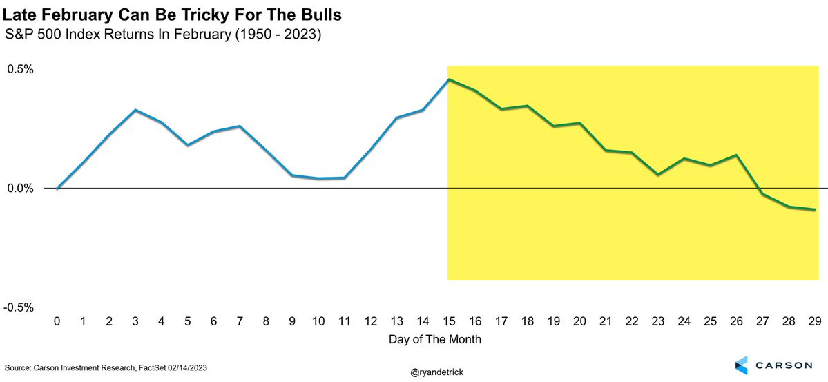Sentiment is extremely bullish, and February has been the worst month for stocks over the last 20 years, with most of the declines coming in the second half of February. Now just because this happened in the past doesn't guarantee it will happen this year. But given all the other signs that momentum is slowing, caution is warranted.