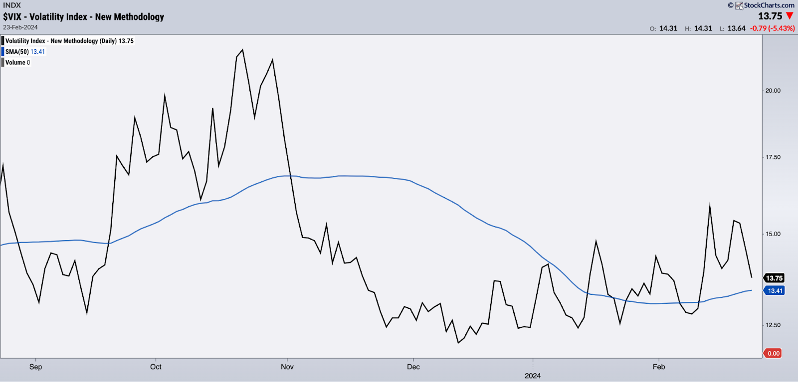 Volatility retreated last week, but the intermediate trend is still up. If the VIX bounces off its 50-day moving average we could still see a pullback in stocks, similar to last fall.