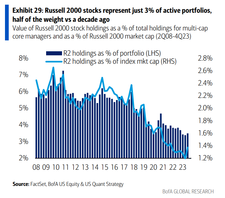 Meanwhile, small caps had one of their largest weekly inflows in nearly 2 years, and active manager exposure to Russell 2000 stocks is just 3%. As the economy continues to improve, portfolios will be rebalanced, providing a huge tailwind for small company stocks.