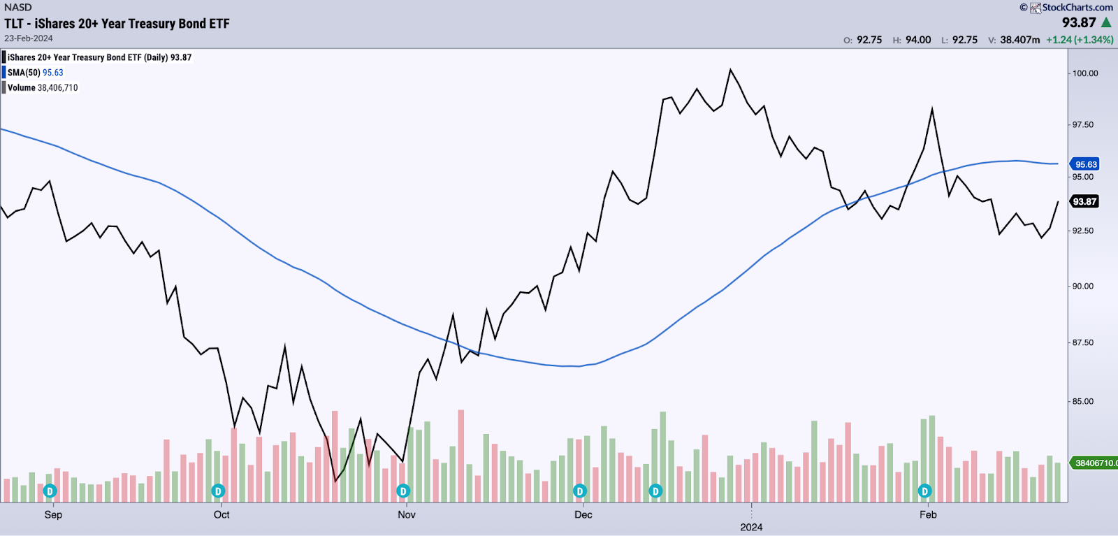 Interest rates pulled back as bonds rallied, but the intermediate trend for bonds is down, which means higher rates. If TLT breaks its 50-day moving average, that could provide the fuel the continuation of this rally.