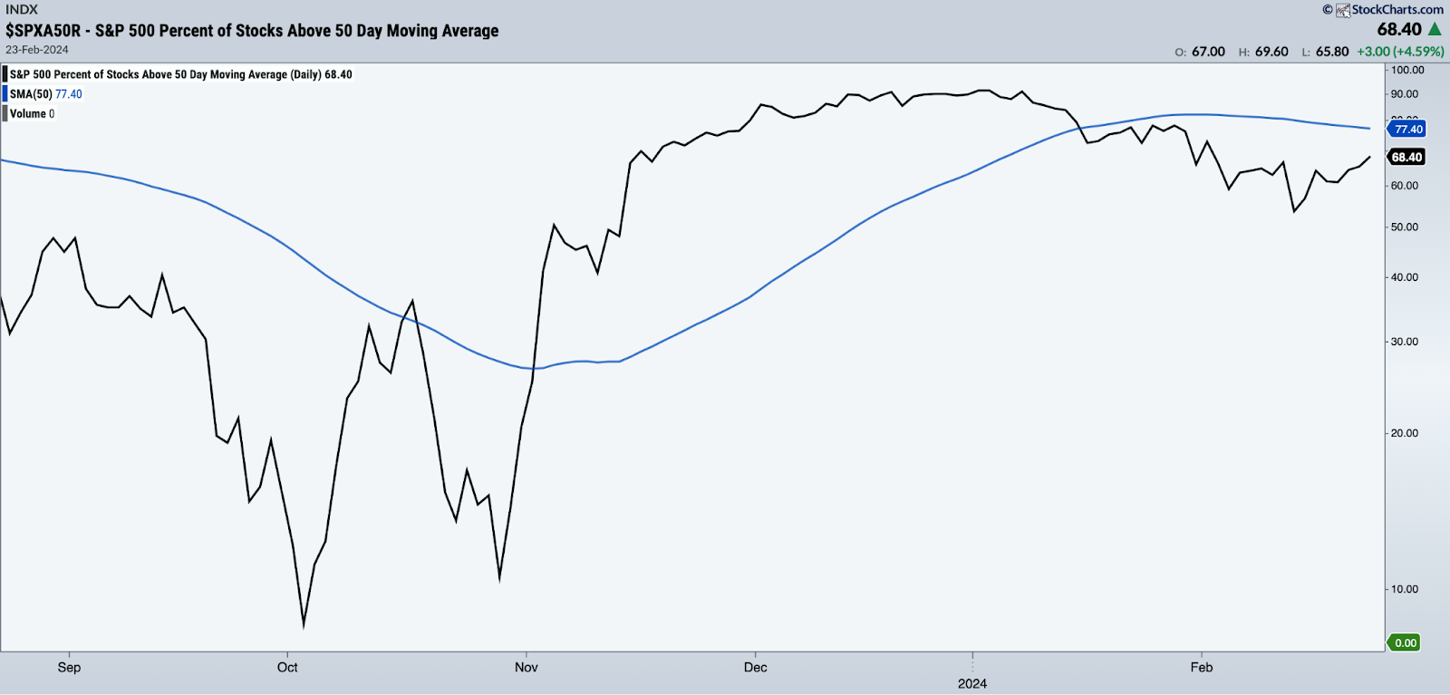 Breadth improved last week as the market made new highs, but the intermediate trend is still down. Without broad participation, we will continue to see a highly fragmented market.