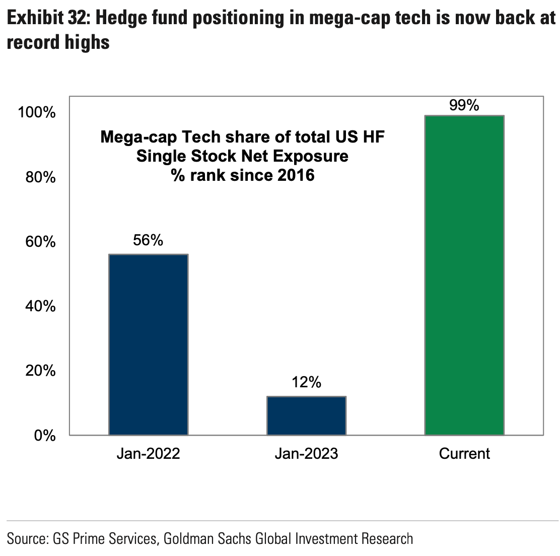 There was near-unanimous sentiment among Wall Street banks on the investment potential for AI. BNY reports that by 2030, AI will boost global GDP by $16 trillion. But for any subscribers trying to invest in these macro trends, we would advise caution on AI stocks over the short term. As we’ve said before, AI is a very crowded trade. And hedge fund commitment to mega cap tech is at record highs (chart below). There’s very few buyers left to propel prices higher.