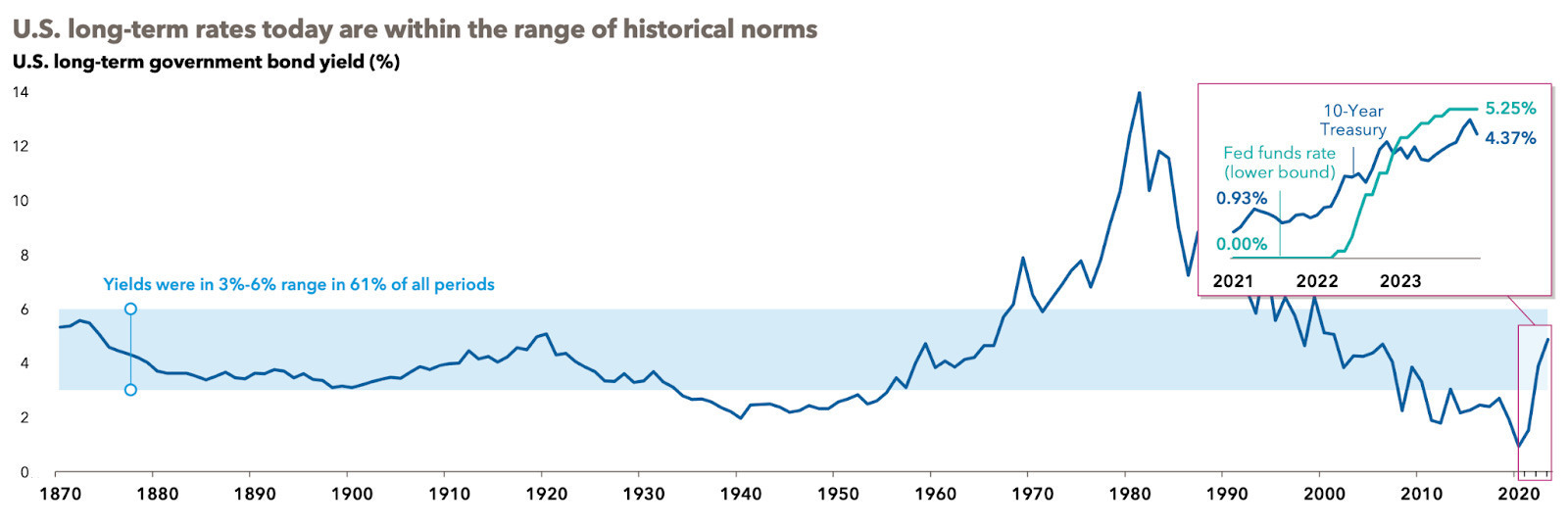 Yields on U.S. government bonds are within the normal range over the last 150+ years despite all the Fed rate hikes (image below). While we’ve gotten used to below average rates for much of the last 15 years, we are unlikely to return to an environment of cheap money any time soon.