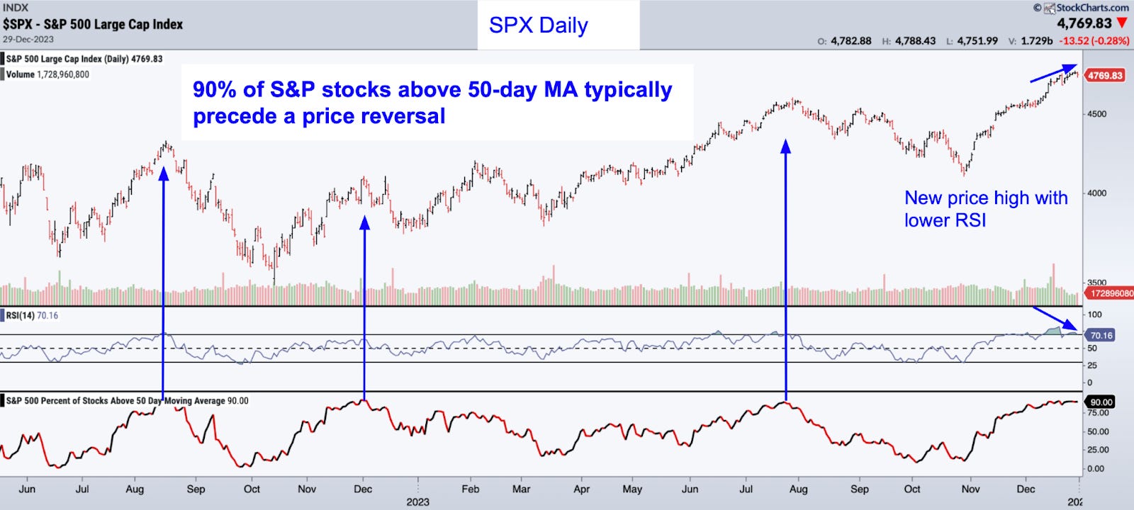 We think the market is due for a pullback. Last week the SPX made a new price high on lower RSI. 90% of the S&P 500 stocks are above their 50-day moving average, a level that has preceded every significant pullback over the last year. We may very well get a sideways correction like we did the first quarter of 2023. But either way the market appears overextended.