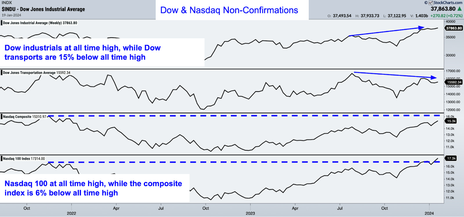 The Dow industrials has continued its push to new all time highs, but the transports are still 15% below its all time high set in November 2021. It is easy to dismiss this given how the market has mostly been driven by rates and inflation. But the Dow Theory remains the oldest and one of the most reliable technical indicators. According to Dow Theory, a bull market doesn't begin until the the transports confirm the industrials rally with a new high.