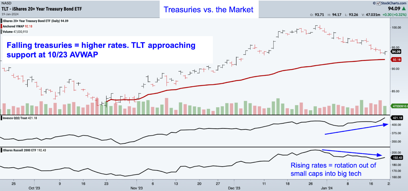 Last week we cited RSI divergence as a reason for further consolidation. But in this news-driven market, rising rates provided just enough of a jolt to big tech to get the S&P 500 to a new closing high. We’ll be watching how TLT trades near the 10/23 AVWAP. A rally off this support line should give small caps a boost.