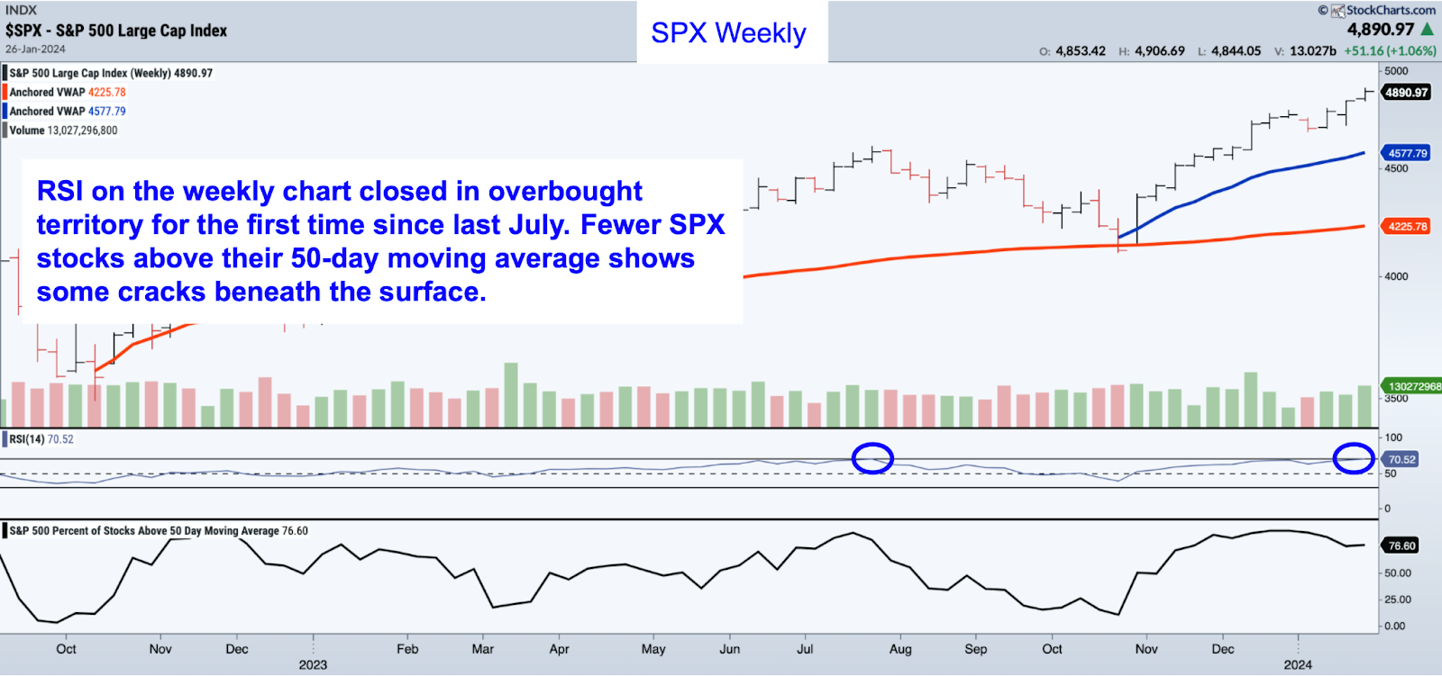 RSI on the weekly chart closed above 70 for the first time since last July, just before a 10% correction in the SPX. While the index closed at a new all time high, the number of S&P stocks above their 50-day moving average has declined over the last month. While a breakout to new highs is bullish over the long term, these are all signs the current rally is overstretched on a short-term basis. We would be cautious with large caps and especially tech over the next 3-5 weeks.