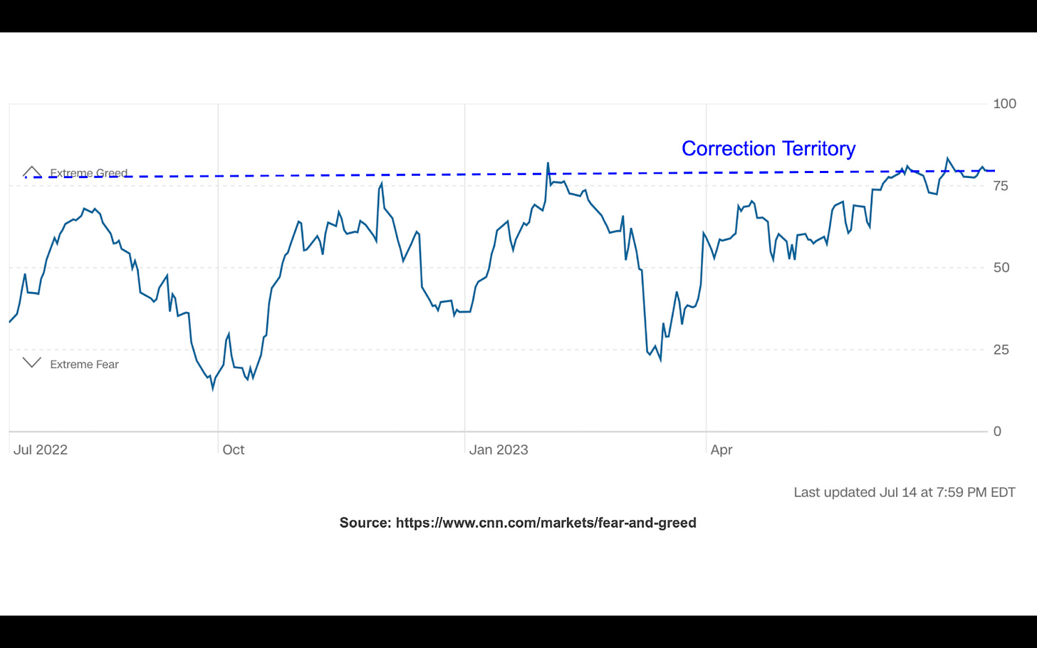 The CNN Fear & Greed Index closed the week at 80, keeping the index in extreme greed territory since June 27th. Readings above 80 tend to coincide with market corrections.