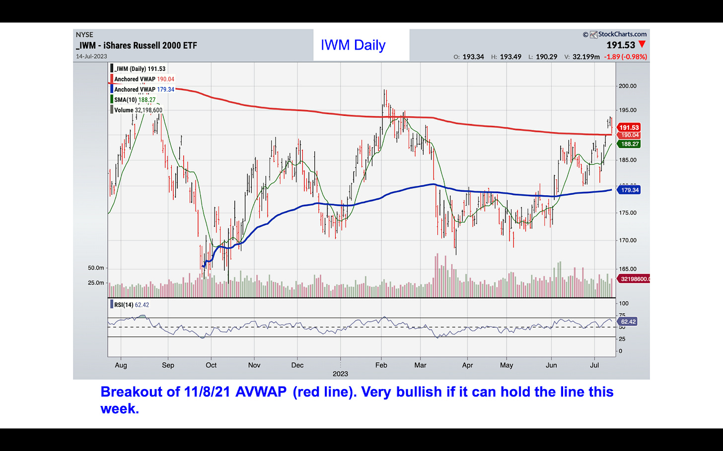 IWM closed the week above the 11/8/21 AVWAP, which is the cumulative average price since the all time high. At a practical level, this means the average buyer/short seller since the market topped in 2021 is near breakeven, and therefore there’s very little psychological resistance. Speculators have already been reducing short positions since February, and buyers are unlikely to sell given the recent market momentum. This is the 5th time IWM attempted a breakout of the 11/8/21 AVWAP, so this week will be critical. We added 3 positions to the portfolio to take advantage of Friday’s selloff. If IWM can hold above $189 this week it will be a very bullish sign for small caps.