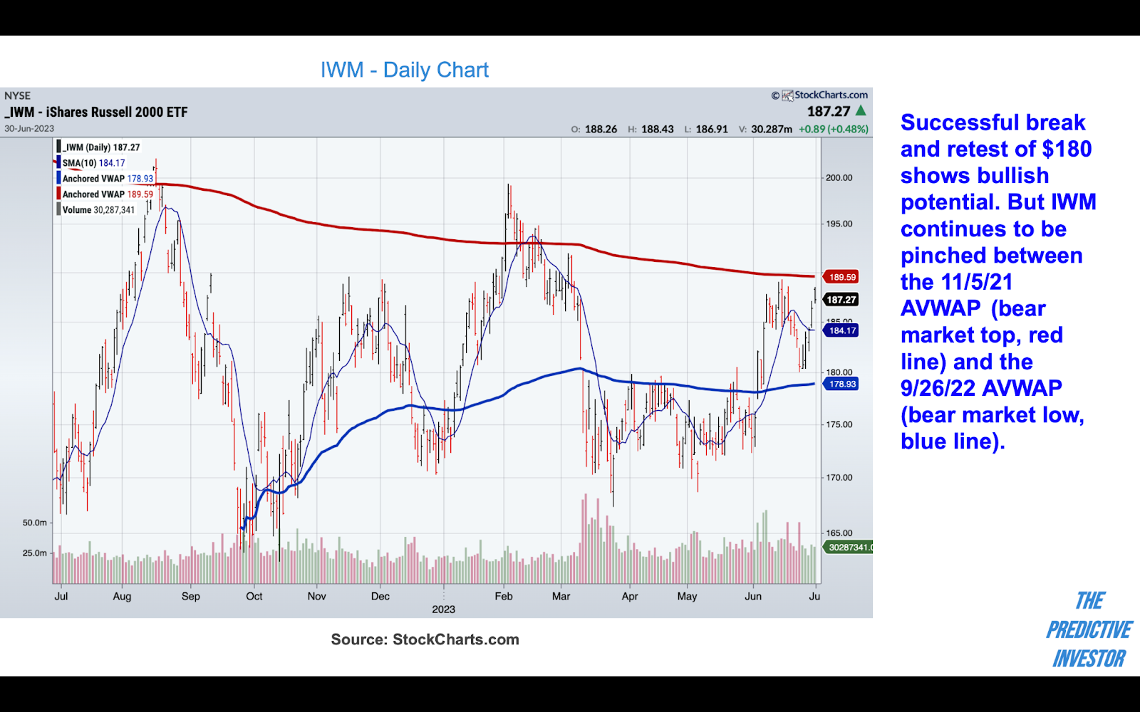 Last week saw a successful retest of $180, but IWM continues to be stuck between the cumulative average prices from the bear market top (red line) and bear market low (blue line). This is partially why we’ve been so cautious - the bulls are not yet in control of the small cap index.