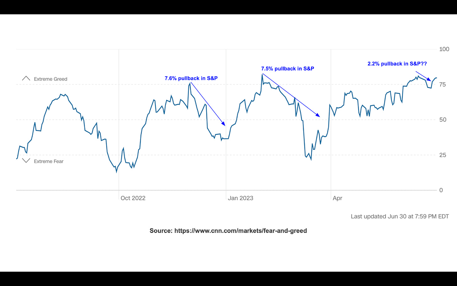 The CNN Fear & Greed Index closed the week at 80, placing it back into extreme greed territory. A 2.2% pullback in the S&P 500 is not exactly what we had in mind when the index entered into extreme greed territory 2 weeks ago. While the fact remains when the index is at or above 80, the risk for a significant pullback is elevated, extreme optimism can often persist until there is a full capitulation by the short sellers.