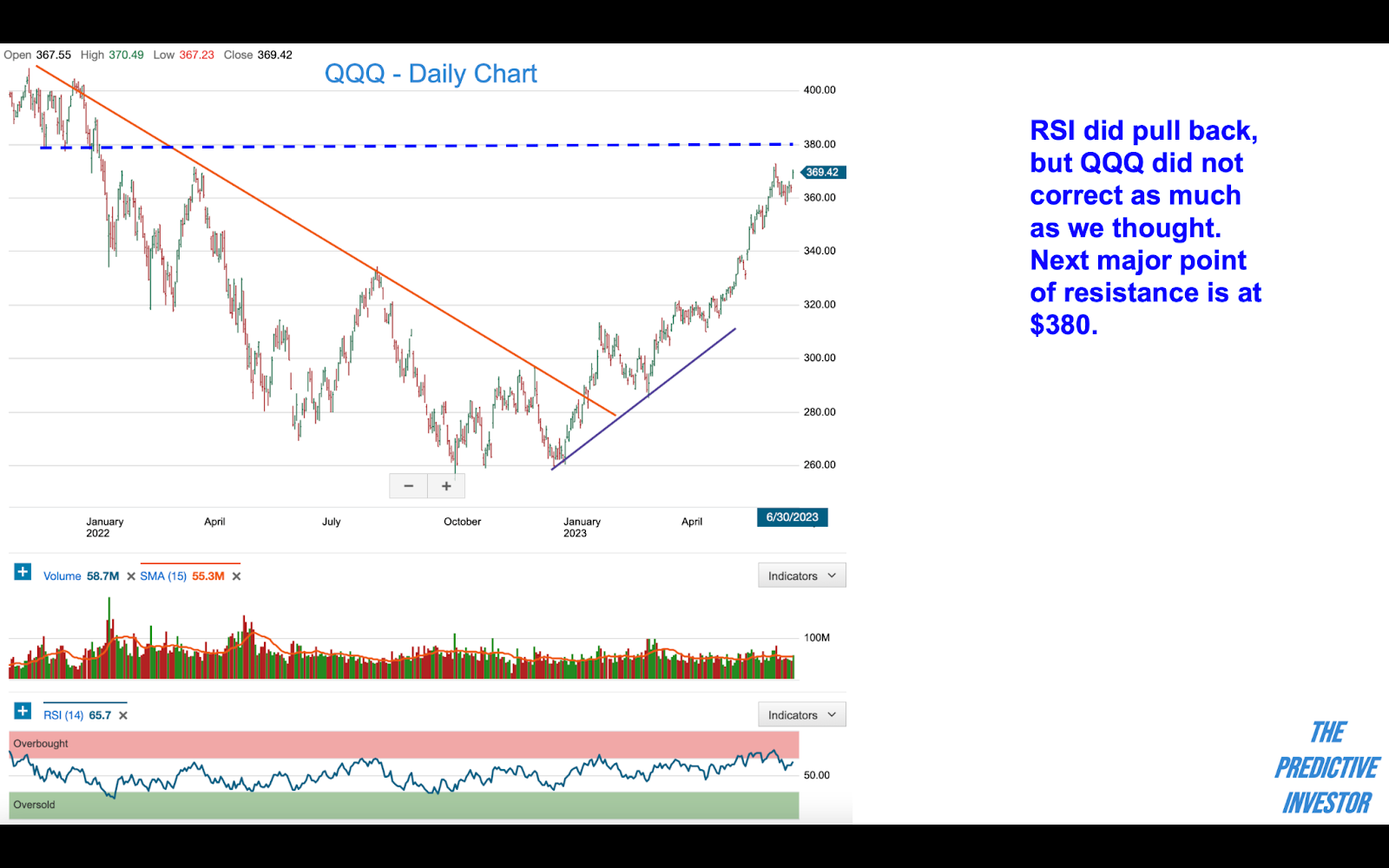 QQQ did not deliver the pullback we expected, hitting a low of $357.59 on Monday vs. our short term target of $355. QQQ did not break above its mid-June high like SPY, but did gap up on Friday with strong volume, indicating further upside ahead. Overall, the market is still due for a pullback. We’ll be watching $380, the next major point of resistance for the tech ETF.