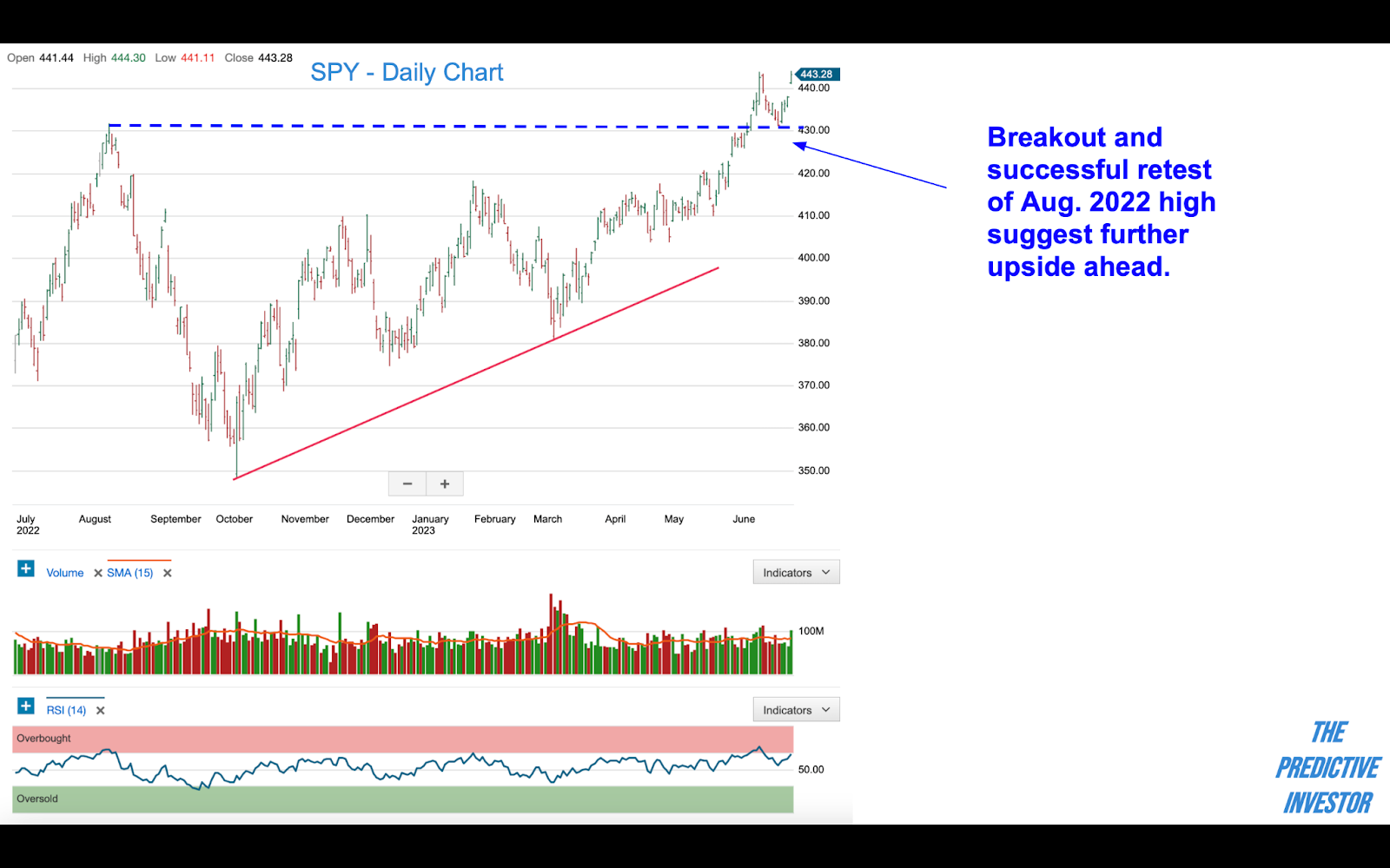 SPY did not correct as much as we thought, but did manage to successfully retest its August 2022 high. Friday’s gap up on strong volume suggests further upside ahead.