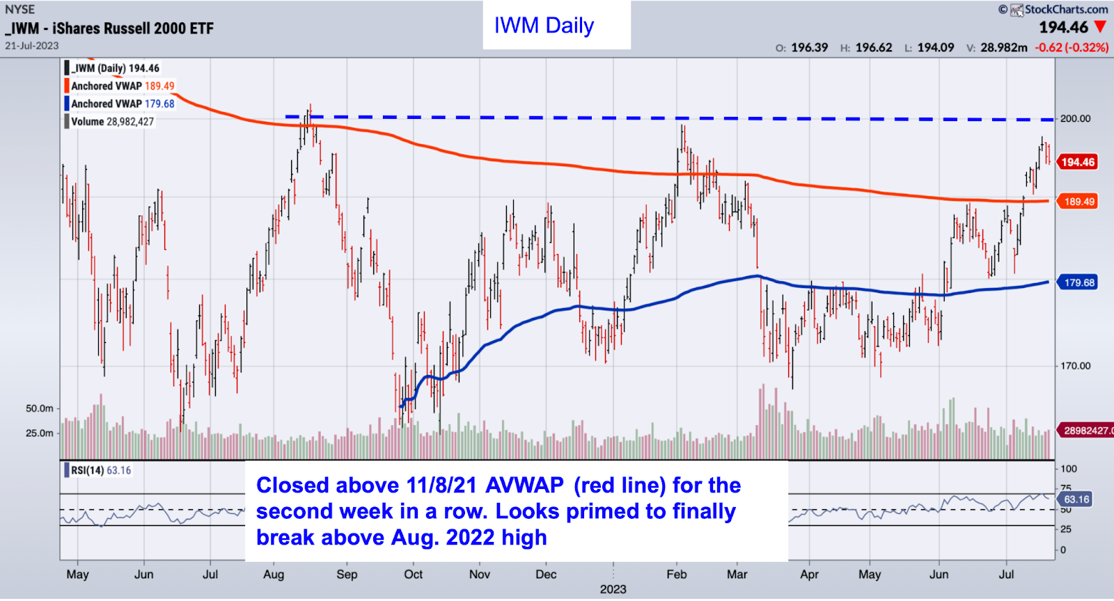 IWM closed the week above the 11/8/21 AVWAP for the second week in a row, and looks primed to take out the August 2022 closing high of $200. We will add some stocks to the portfolio next week if we get a pullback.