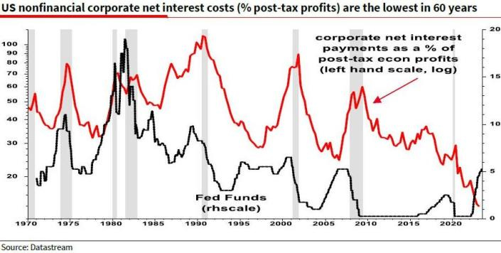 Typically when rates increase, so do corporate interest payments. But it turns out interest expenses are at the lowest level in decades (see chart below), as companies took advantage of record low rates to refinance liabilities into long term fixed-rate debt. This means companies did not have to resort to as many layoffs as analysts predicted.
