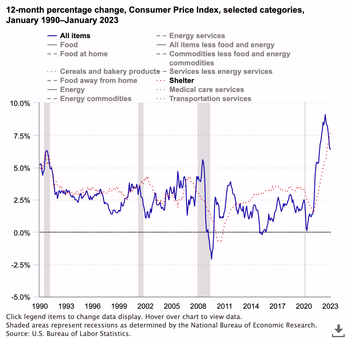 Housing makes up over 43% of the CPI, and the calculation includes rent and Owners Equivalent Rent, which is an estimate of what homeowners would have to pay to rent a similar house. Currently, the shelter component of CPI is up about 8% year-over-year.