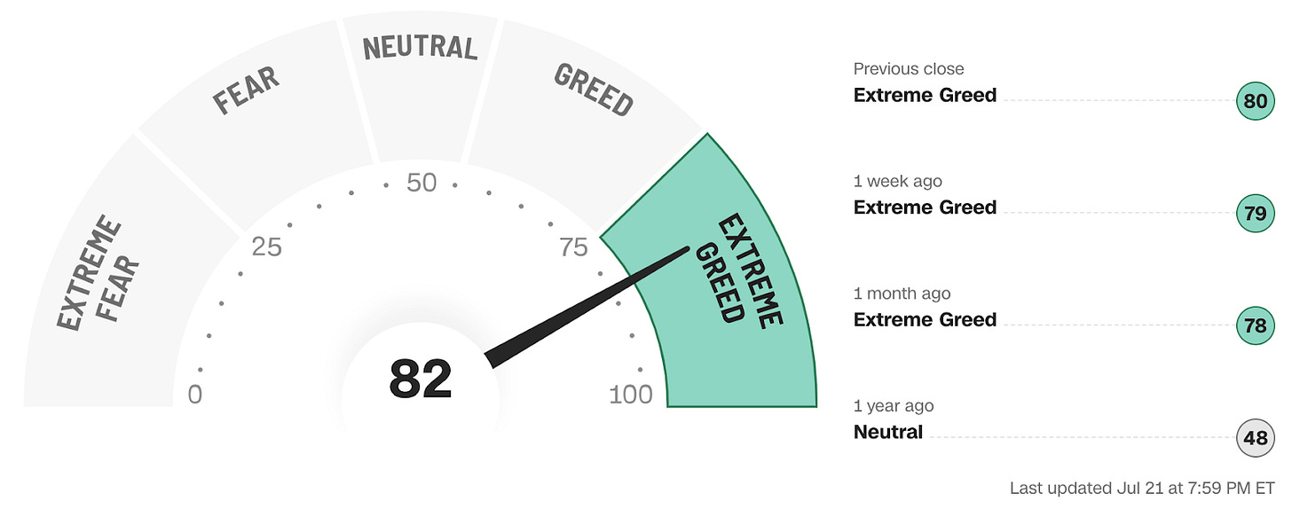 The CNN Fear & Greed Index closed the week at 82, keeping the index in extreme greed territory since June 27th. Readings above 80 tend to coincide with market corrections.