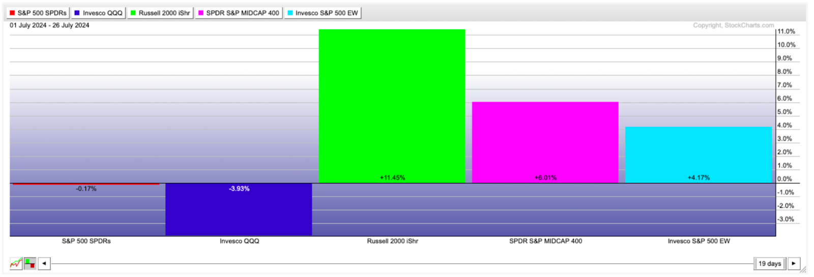 Since the first of the month, the S&P 500 is essentially flat while the equal-weight S&P 500 is up over 4%. The tech-heavy QQQ is down 4% while the small and mid-cap ETFs are up 11% and 6% respectively.