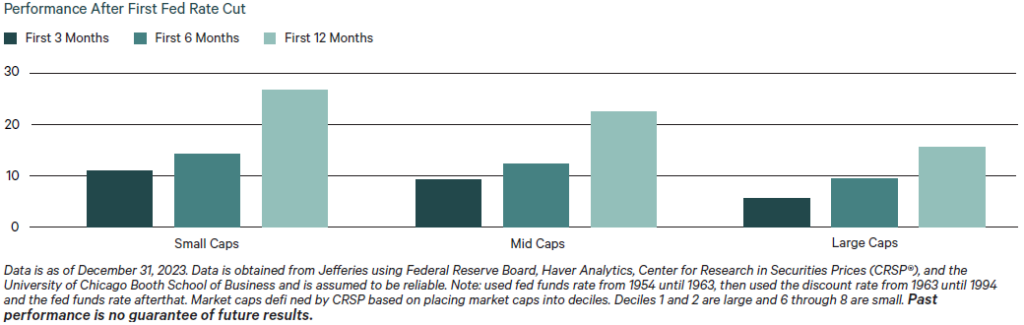 Historically, small caps outperform large caps as interest rates decline. Cheaper borrowing costs have a more meaningful impact on smaller companies' bottom line. It also fosters more M&A activity, as it becomes easier to acquire smaller companies at a premium.