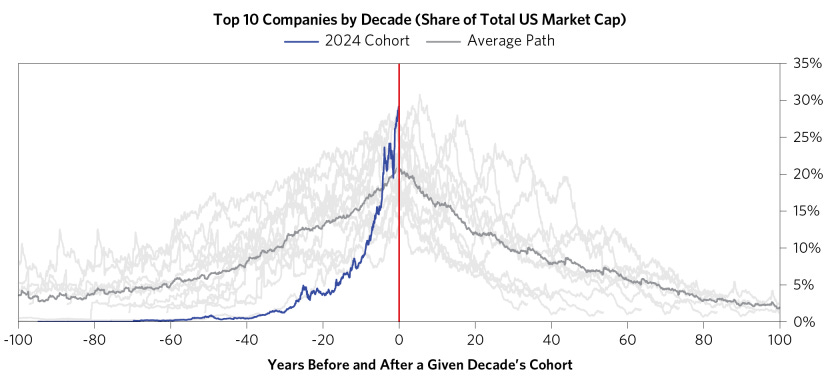 The chart below from Bridgewater caught our eye, showing that market leaders rarely stay on top forever. We’re certainly not going to bet against the Magnificent 7. Just keep in mind their success through the next wave of innovation is not a foregone conclusion.