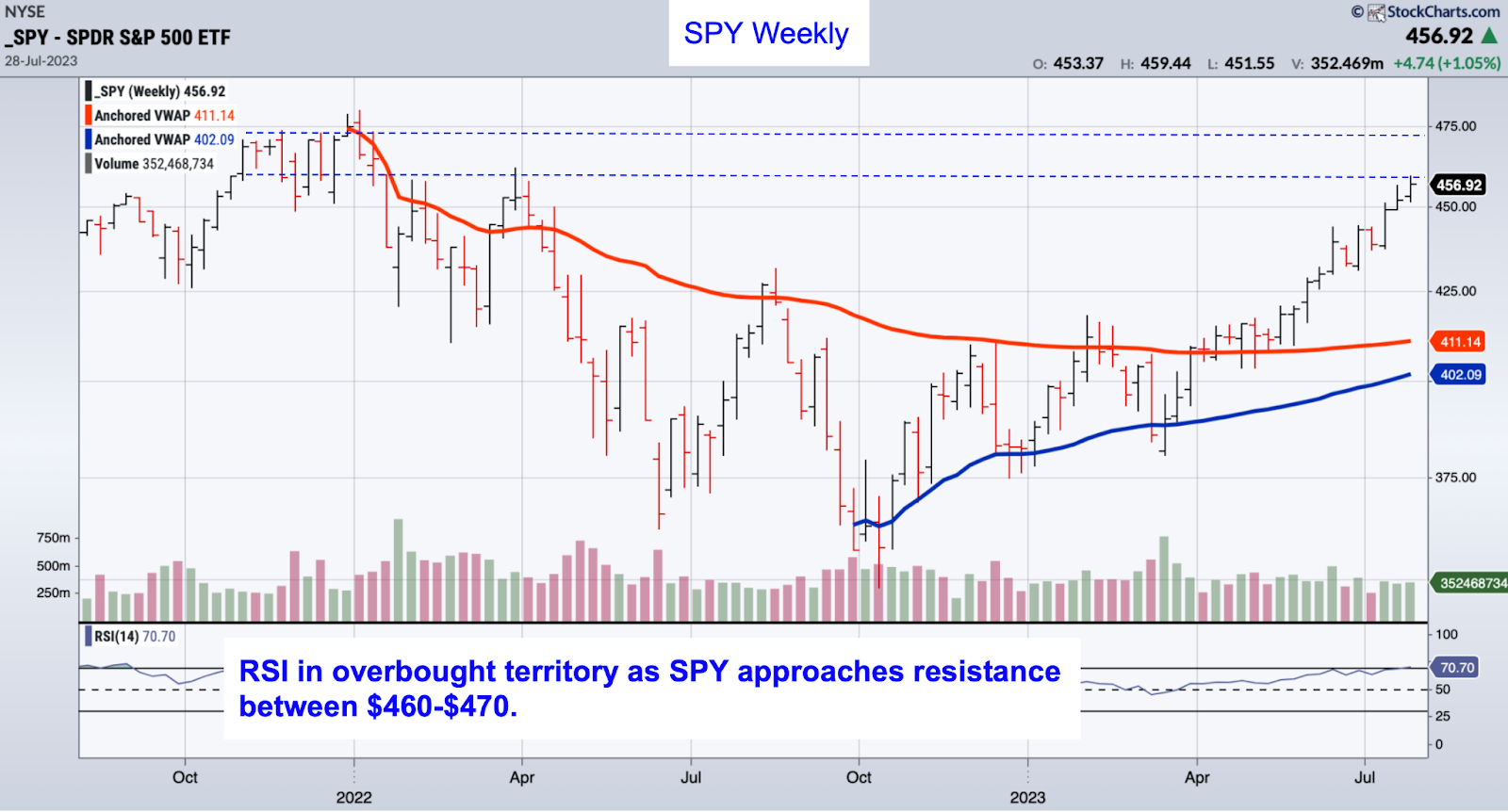 RSI is entering overbought territory as the index approaches a band of price resistance between $460 and $470. Unless Apple or Amazon disappoints with their Q2 results, the S&P looks increasingly likely to test the all time highs before any real correction.