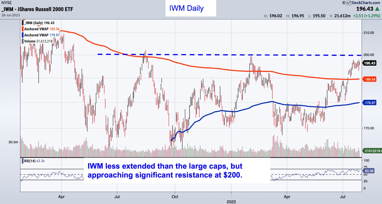 IWM is less extended, on both a price and valuation basis, than the large cap indexes. While it may stall at $200, there’s solid support at $190, which limits downside risk at current levels.