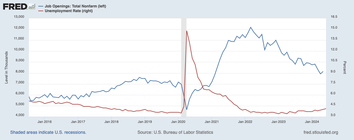 Monthly job gains came in above expectations, and there are still more jobs available than those unemployed (although that ratio is shrinking).