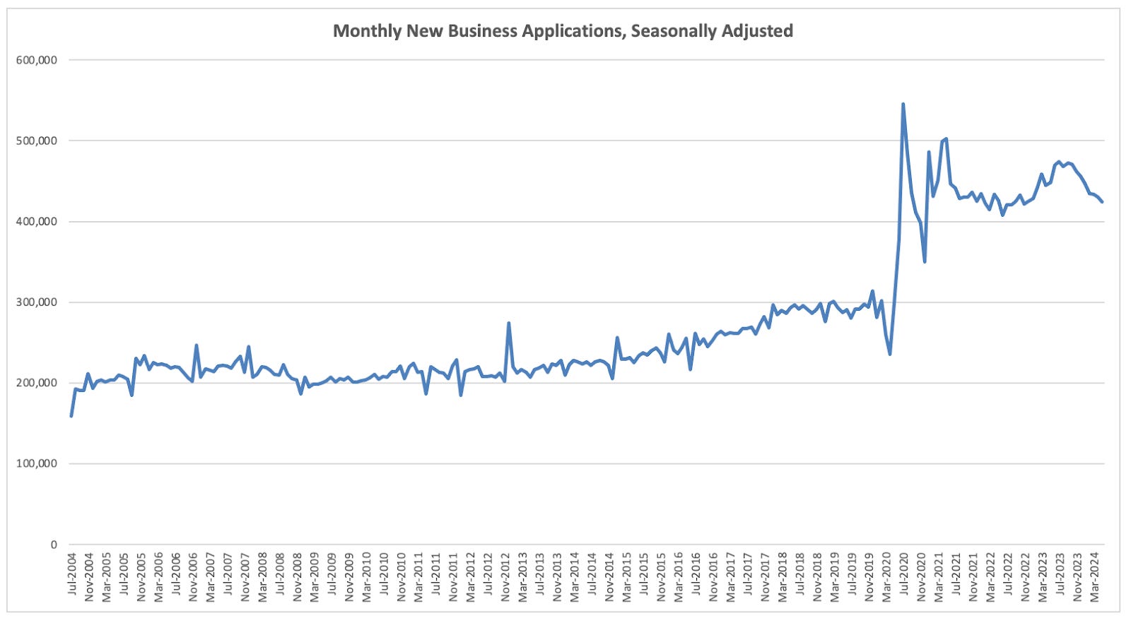 The post-Covid boom in entrepreneurship continues to defy expectations, with monthly new business applications surpassing 400,000/month for more than three years.