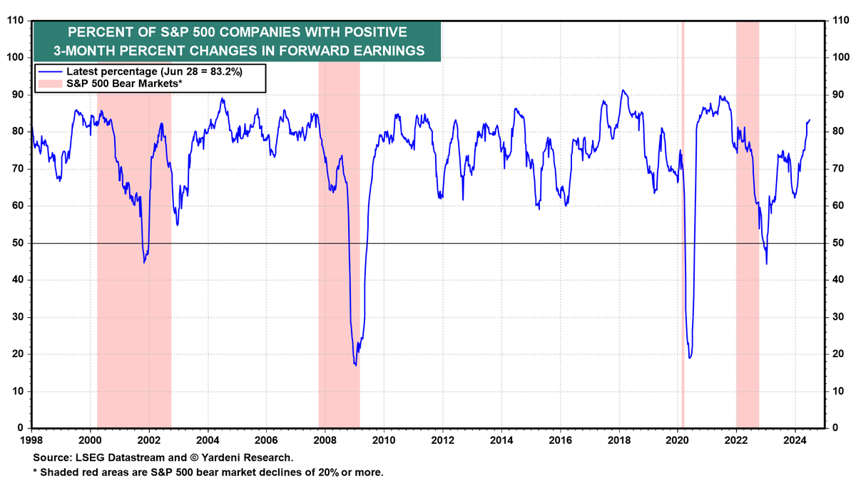 Earnings drives stock prices, and the percentage of SPX companies with positive 3-month changes in forward earnings projections has been increasing. This suggests we should expect broadening of the bull market beyond mega cap growth.