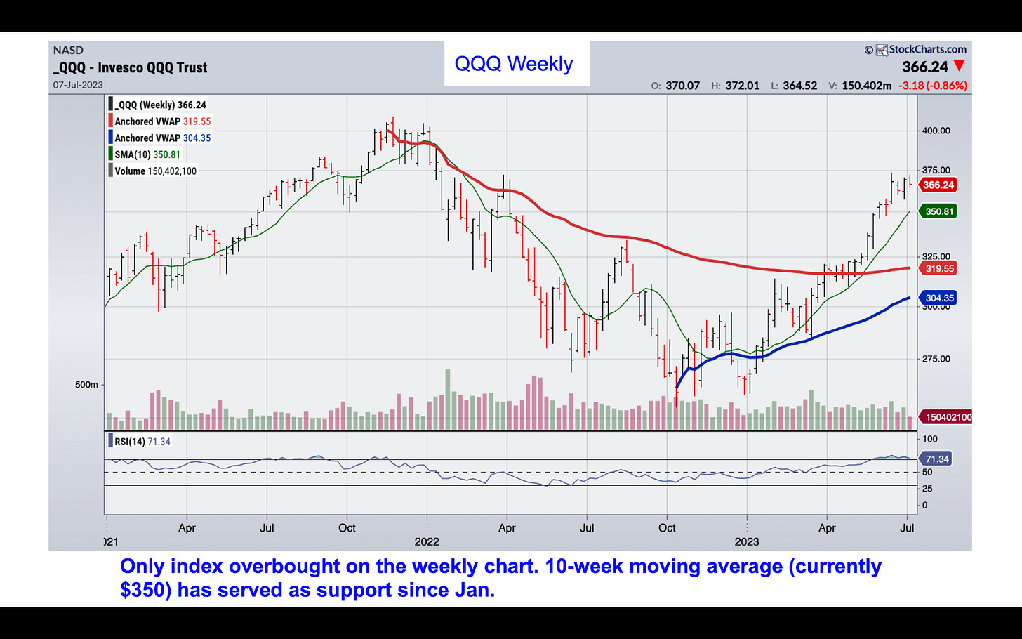 RSI is overbought on the weekly chart, and trending down on the daily. We would stay away from big tech until we get a pullback. The 10-week moving average (currently at $350) has provided solid support since January.
