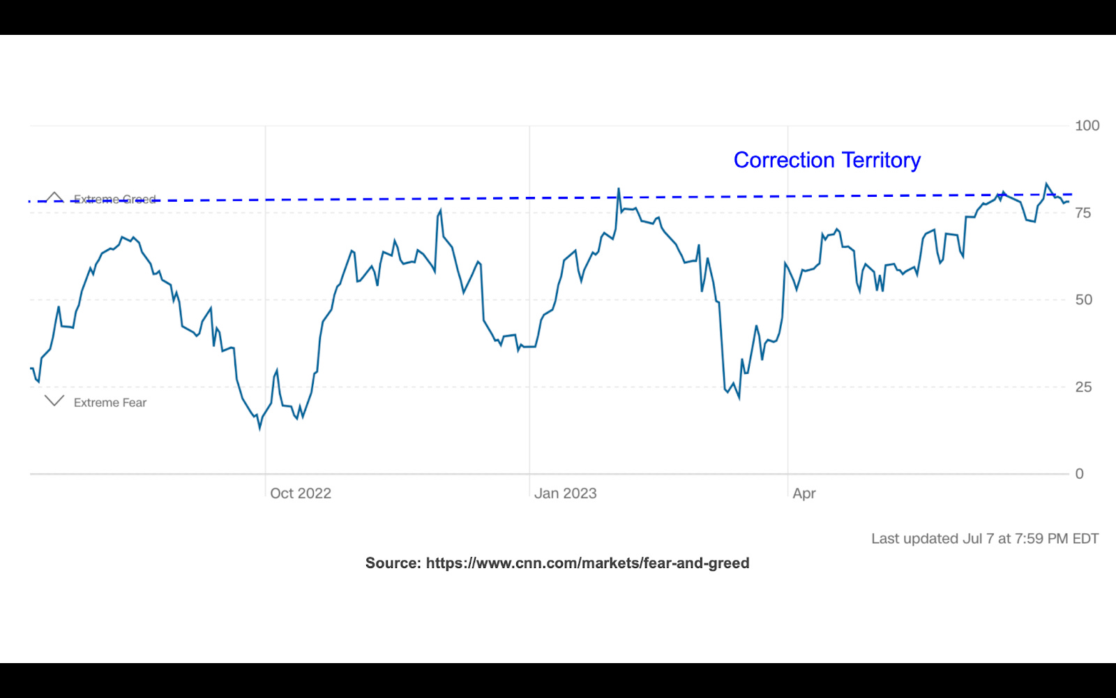 The CNN Fear & Greed Index closed the week at 78, keeping the index in extreme greed territory since June 27th. Readings above 80 tend to coincide with market corrections.