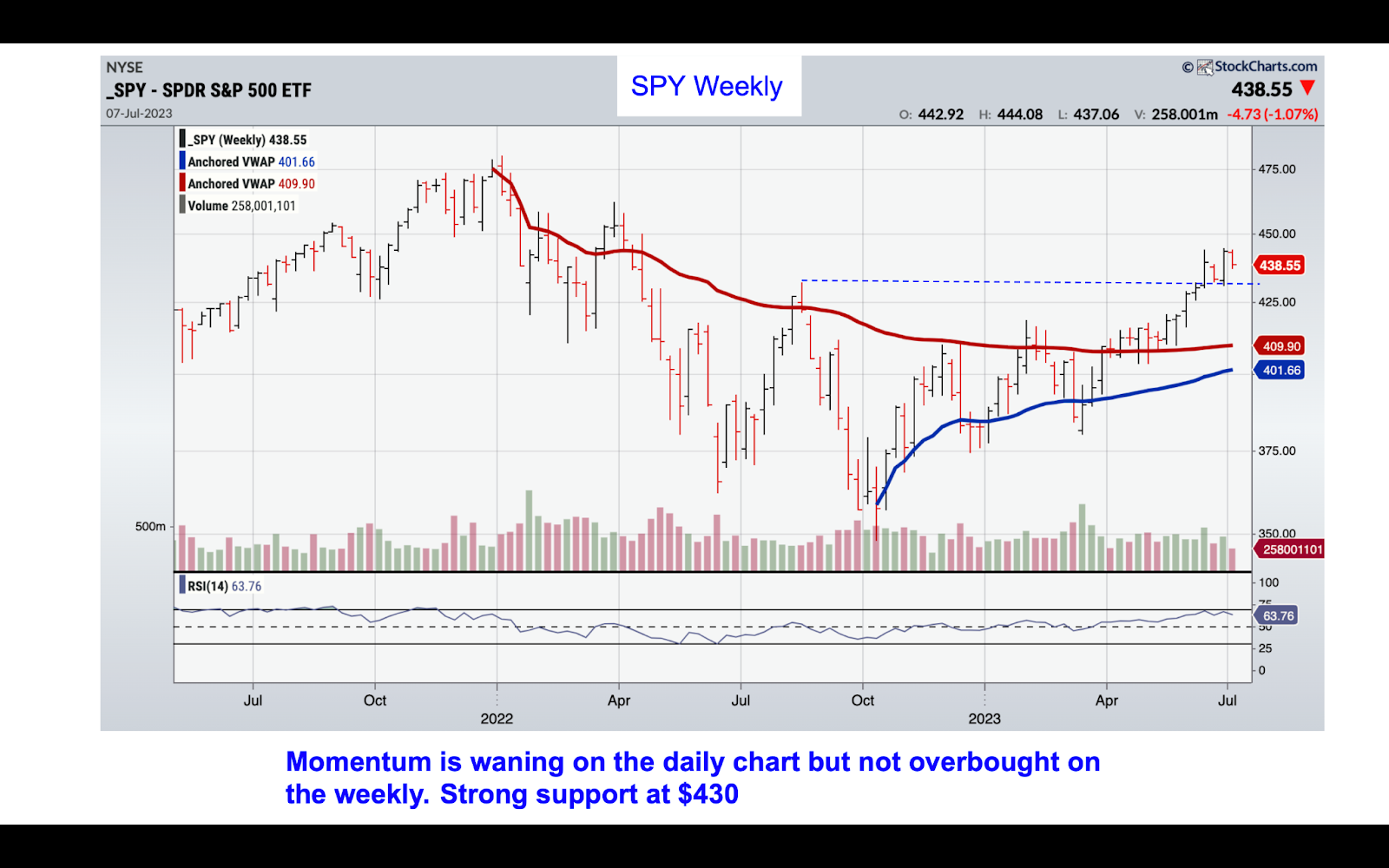 RSI is declining on the daily chart, but relatively flat on the weekly (below). If the market does pull back, $430 offers solid support.