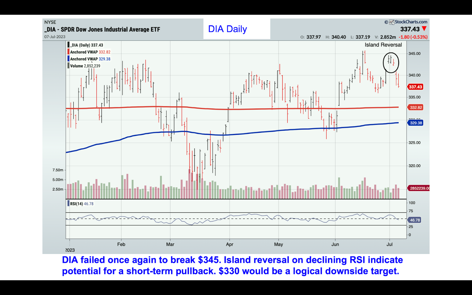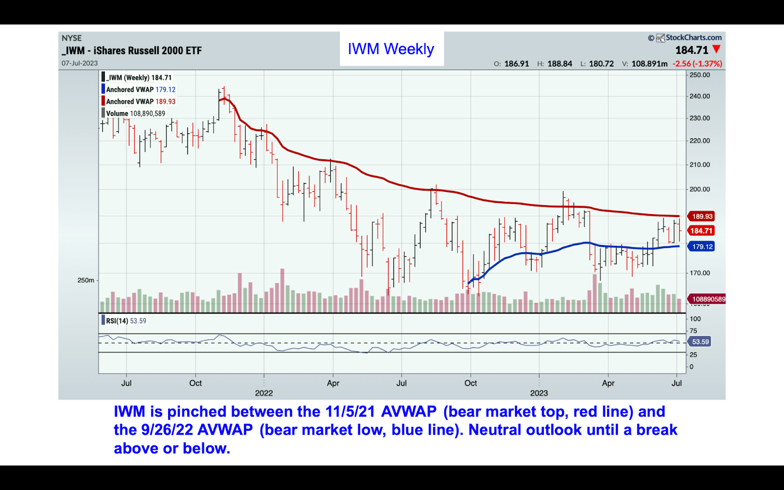 DIA is the weakest of the market indexes. Last week closed with an island reversal near long term resistance of $345, along with a declining RSI. Flat AVWAP lines from the market top (red line) and the bear market bottom (blue line) indicate very little conviction among both bulls and bears.