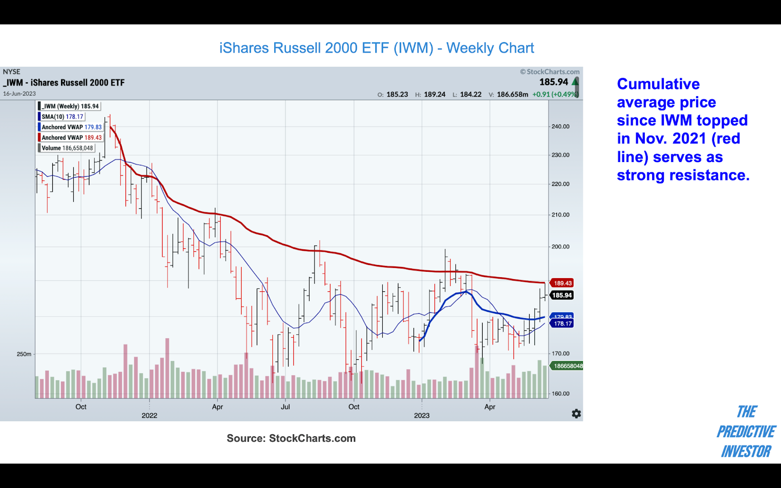 IWM bounced off resistance at the cumulative average price since the index topped in November 2021 (red line on the chart). While the 10-week moving average and the AVWAP from January 1st (blue lines) are beginning to trend up, the bulls are not yet in control of the small cap index.